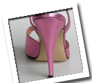 Classic opentoed sandal with crossed ankle strap and golden buckle; made of pink opalized leather, with leather lining and 4inch spiked heel. Entirely hand-made from highest quality leather and natural fabric